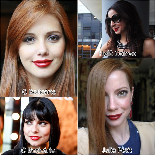 Mas essa pegada diva não está se mostrando forte só por aqui. As famosas, como vocês sabem, usam e abusam do batom que é sinônimo de poder e sedução desde os primórdios da maquiagem. E nas semanas de moda ele também bombou. No lounge do Boticário, foi uma das makes mais pedidas, e também a aposta da ruiva Julia Petit durante alguns dias do evento. As blogueiras também elegeram o batom vermelho como ponto forte de vários looks. Na montagem, Helô Gomes, do Sanduíche de Algodão.