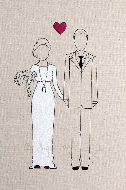 Já pensou em ter várias versões das suas fotografias de casamento? Pois caimos de amores por essa ai. Os noivos, com suas características principais (ou as de seus personagens adorados), são bordados em um pedaço de pano, que vira um lindo quadro ou portarretrato pra você guardar pra sempre. Até o cachorro querido pode fazer parte dessa imagem a ser guardada pra sempre.