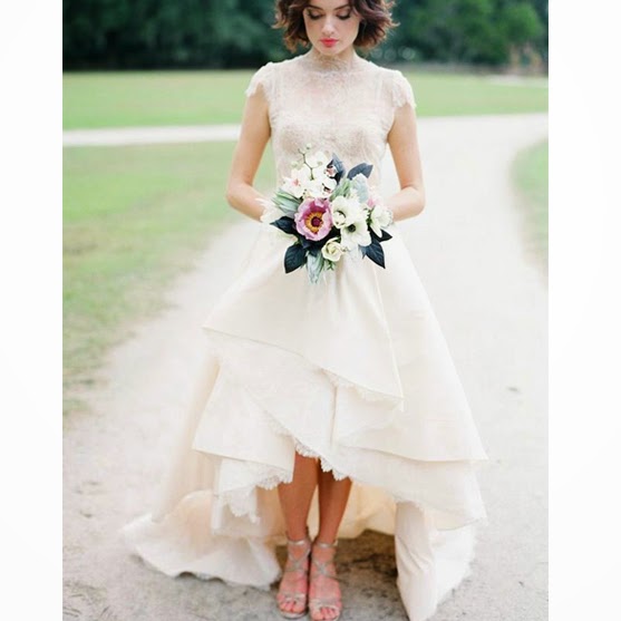 O vestido pode ser curto ou longo, mas com tecidos mais leves. O gosto depende do gosto da noiva.