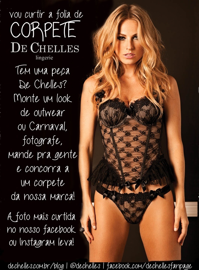 Pensando nisso, resolvemos criar uma promoção e presentear uma de nossas clientes com um dos corpetes acima. Vai funcionar da seguinte forma: você tem ou comprou recentemente uma peça ou corpete De Chelles? Monte um look com ele, seja de outwear, seja de Carnaval, e mande pra gente! Tem que ser look usável no dia-a-dia ou nos dias de Carnaval! As fotos serão publicadas no nosso Instagram (@dechelles) e no nosso Facebook. A mais curtida, em qualquer uma das redes, vai levar um corpete de presente! Que tal?