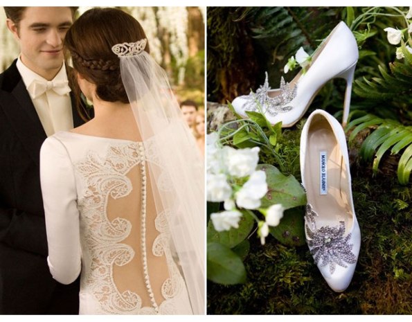 Oba, a Vogue acabou de liberar detalhes do vestido da Bella, que ainda não tínhamos conseguido mostrar aqui. Longo, de mangas compridas, ovestido é feito de cetim e renda francesa Chantilly, que aparece nos punhos nas costas, e leva 17 botões em cada manga, mais outros 152, usados para fechar o vestido na parte traseira. Para combinar, sapatos de salto alto com enfeite brilhante Manolo Blahnik.