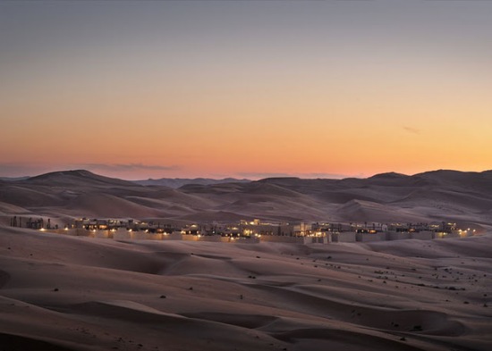 O hotel fica a duas horas de Abu Dhabi, nos Emirados Árabes. O interessante é que se misturam ali o rústico do deserto com a modernidade da arquitetura. Tudo muito suntuoso, mas encantador.