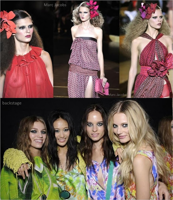 Ainda na linha da praticidade, os cabelos ondulados voltam com tudo, dando um alívio para quem depende da chapinha ou do secador. Junto com elas, as flores nos cabelos também apareceram nas passarelas – a cara do verão e a aposta de Marc Jacobs.