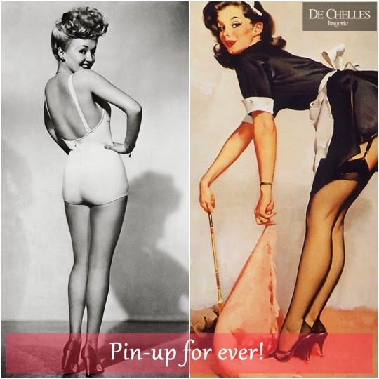 A mistura de inocência e sensualidade define as imagens das pin-ups. As moças com cinta-liga, shorts de cintura alta e saias levantadas eram muito populares na década de 1930 e 1940. As ilustrações acompanhavam os soldados nos campos de batalha e eram penduradas nas paredes para animar as tropas. Daí o nome pin-up, em inglês, pendurar.