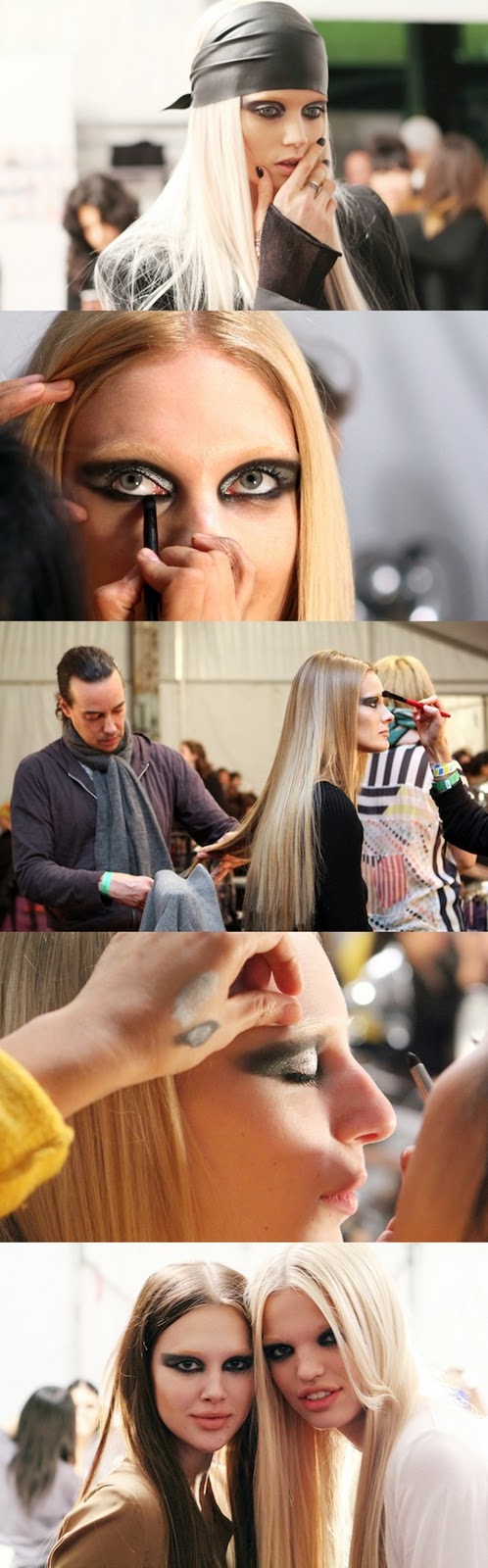 Dúvida sobre qual maquiagem usar na balada no verão? Aposte no metálico esfumado!! Realça o olhar, é super estiloso e tem aquela pegada olho-tudo-boca-nada, super prático pra qualquer combinação. A make foi a aposta da Versace para H&M, que aconteceu nos últimos dias. Confiram alguns cliques de backstage do blog Into the Gloss:
