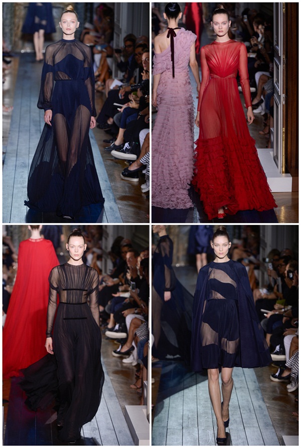 Nos desfiles em Paris, Valentino arrasou com a elegância de sempre. E investiu pesado nos recortes com transparências. Todas as cores foram, em pelo menos um vestido, trabalhadas no contraste entre um tom mais forte e a transparência. Confirmação da tendência que continuará mais do que forte.